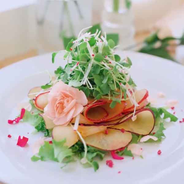• Let’s Not Beet Around Bush with whipped chèvre, baby arugula, heirloom beets, stone fruit, pickled red onions, crumble dill pistu, lavender – basil vinaigrette, micro sorrel