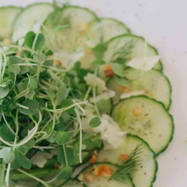 • Baby Arugula & Organic Sproud Salad with red and yellow cherrry tomatoes, silvered baby cucumber, pickled pinnk onions, age balsamic & olive oil vinaigrette GF, V