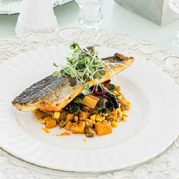 • European Sea Bass (Branzino) with roasted garlic new potatoes, grainy mustard, charred corn roasted pepper stew, crispy shallots