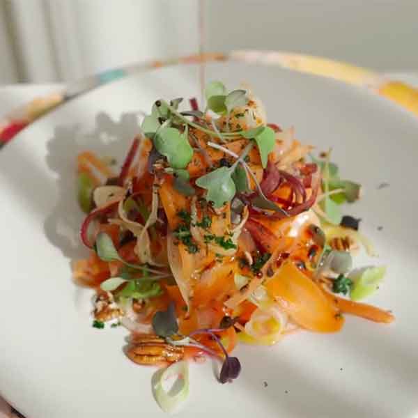 • Heirloom Salad with silvered carrots, shallot, fresh parsley, crumble pumpkin seeds, orange thyme vinaigrette, micro greens, and crispy leeks GF