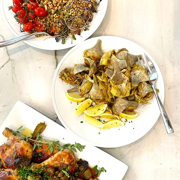 • Chicken Marbella with Tomatoes and Capers with Fried Artichokes and Farro